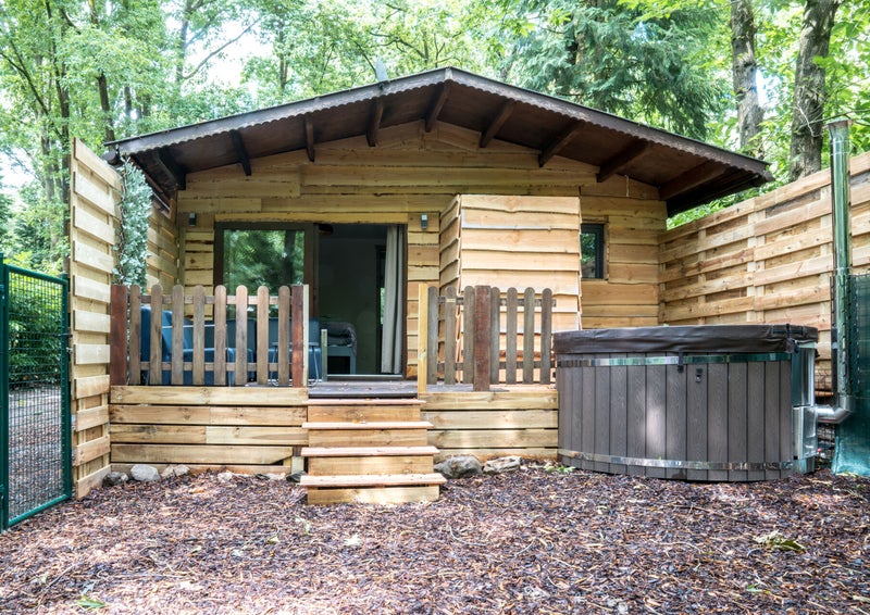 De tuin is volledig omheind met 1 m 50 ijzeren draadschermen, kleine hondjes raken nergens niet weg. Grote honden is dit zeker voldoende. De tuin is 2 are groot, ze kunnen er leuk in rondsnuffelen, langs de tuin kan je zo het bos inwandelen, er is een poortje en op deze manier weet je zelfs niet dat je in een park ligt. Langs de achterzijde zie je enkel het bos. Er is ook een hot tub die apart kan bijgehuurd worden. Mag maar is geen verplichting.